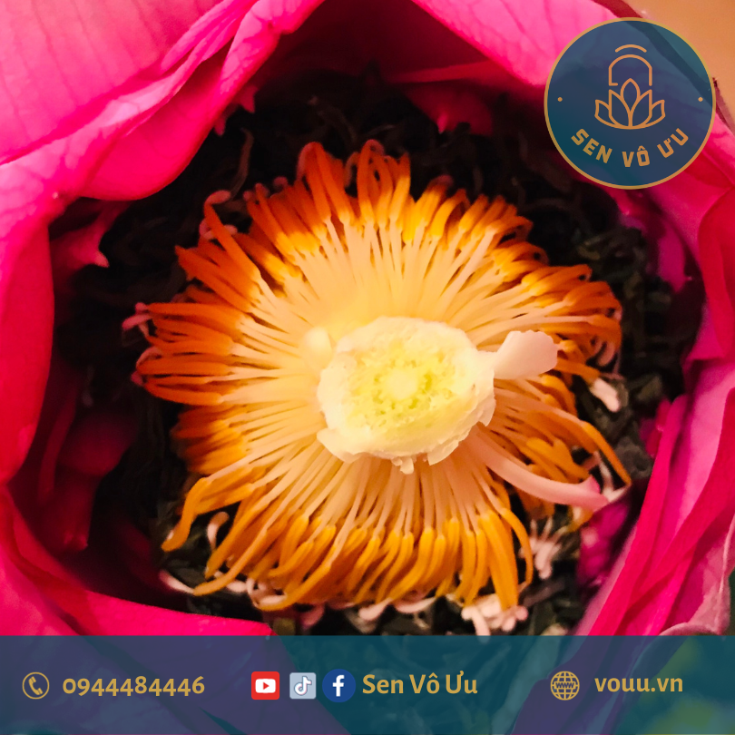 (Lưu ý: phần gạo sen là phần chứa nhiều hương sen nhất trên bông hoa, vì vậy để ấm trà đượm hương và bền nước Vô Ưu khuyên bạn nên tách phần gạo sen pha cùng trà)