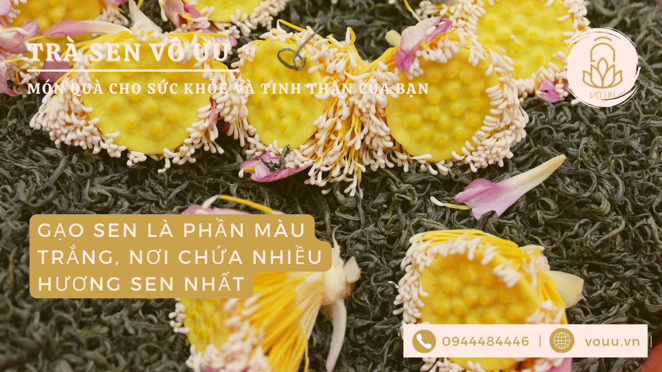 (Lưu ý: phần gạo sen là phần chứa nhiều hương sen nhất trên bông hoa, vì vậy để ấm trà đượm hương và bền nước Vô Ưu khuyên bạn nên tách phần gạo sen pha cùng trà)