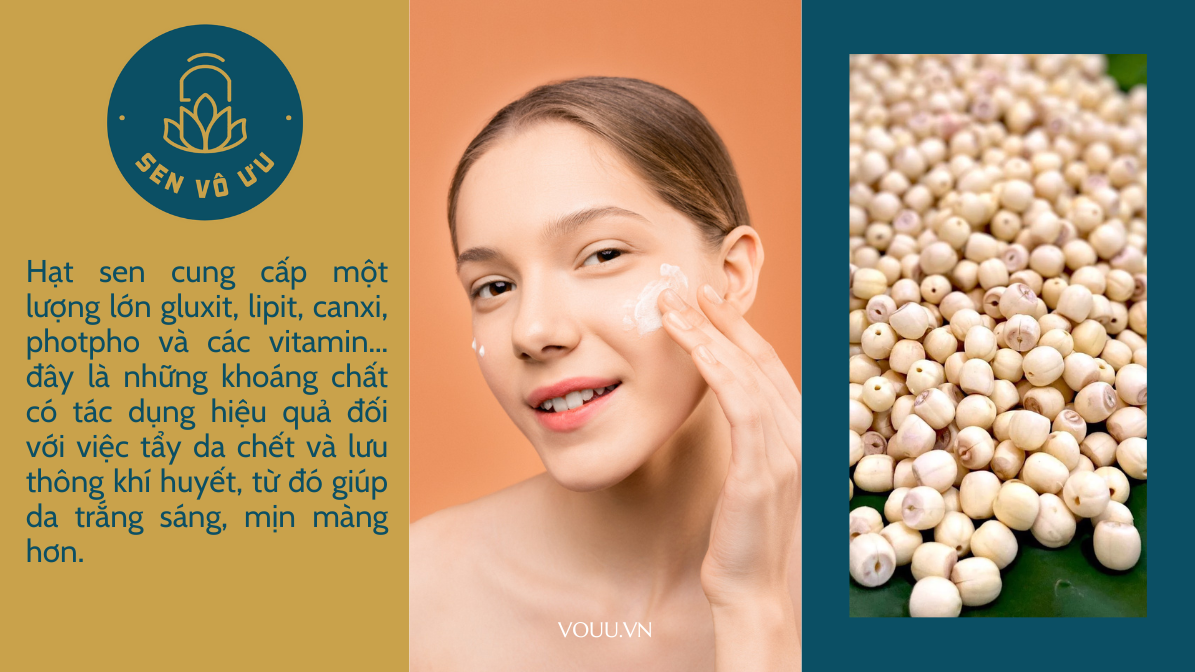 Đặc biệt, hạt sen cung cấp một lượng lớn gluxit, lipit, canxi, photpho và các vitamin... đây là những khoáng chất có tác dụng hiệu quả đối với việc tẩy da chết và lưu thông khí huyết, từ đó giúp da trắng sáng, mịn màng hơn.