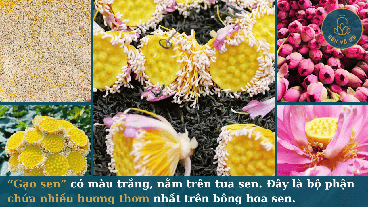 Gạo sen do Sen Vô Ưu cung cấp được tách từ 100% bông sen Bách Diệp Tây Hồ, được thu hoạch vào buổi sớm tinh sương, khi những bông sen còn hàm tiếu (chớm nở). Gạo sen sau khi tách đã được ướp qua 1 lần trà, sau đó được sao vàng và bảo quản kín. Hương từ gạo sen này vẫn đảm bảo còn rất thơm, quyện với hương trà, tạo ra mùi thơm rất thư giãn.