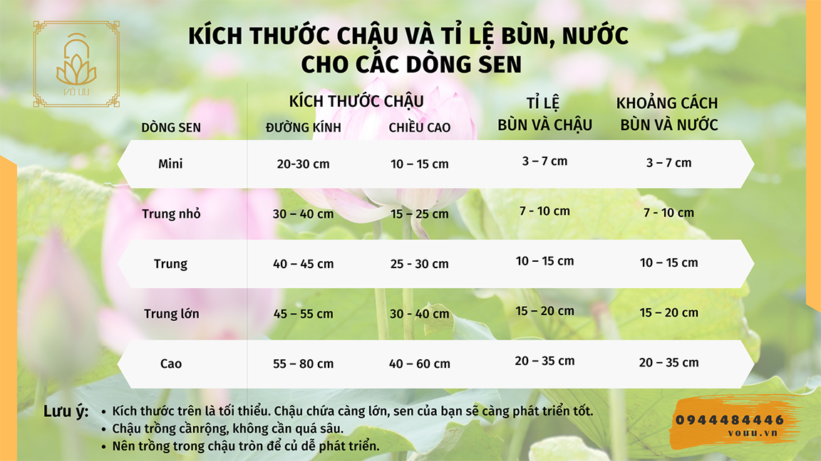 Nhằm đảm bảo các giống sen được trồng trong chậu phát triển tốt nhất, việc lựa chọn kích thước chậu rất quan trọng. Đồng thời, phải đảm bảo tỉ lệ bùn và nước trong chậu phải tối ưu cho từng giống sen. Dưới đây Vô Ưu xin chia sẻ kích thước chậu và tỉ lệ vàng bùn, nước cho từng dòng sen, mời các bạn tham khảo: