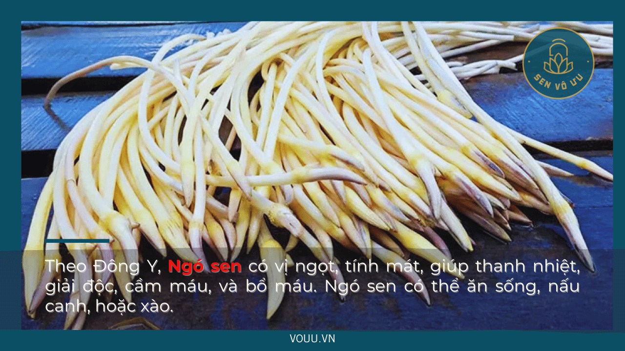 - Ngó sen có vị ngọt, tính mát, giúp thanh nhiệt, giải độc, cầm máu, và bổ máu.