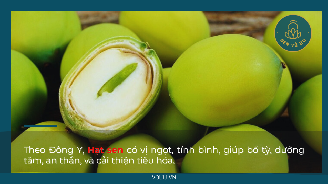 - Hạt sen có vị ngọt, tính bình, giúp bổ tỳ, dưỡng tâm, an thần, và cải thiện tiêu hóa.