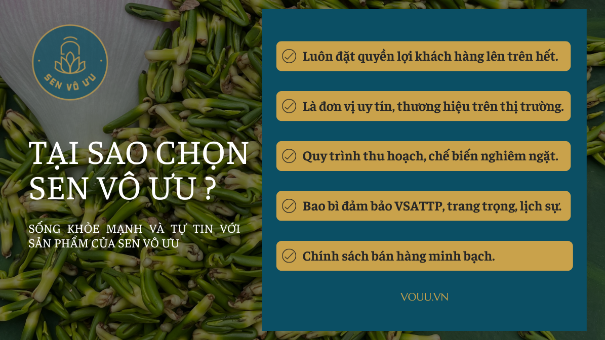 ✅ Sen Vô Ưu là đơn vị có uy tín lâu năm trên thị trường, cung cấp chuyên sâu các sản phẩm, thực phẩm được chế biến từ sen.