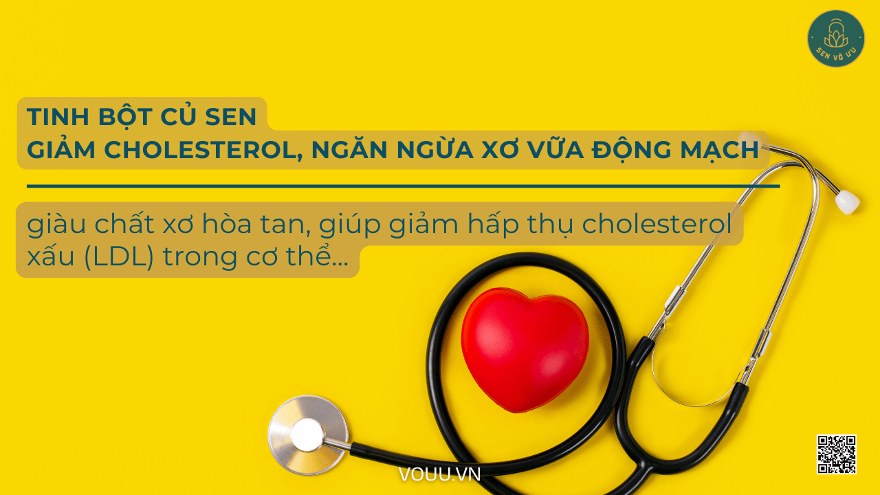Người cao tuổi thường có nguy cơ cao mắc các bệnh về tim mạch như cao huyết áp, xơ vữa động mạch. Tinh bột củ sen giàu kali, giúp điều hòa huyết áp và hỗ trợ chức năng tim mạch. Đồng thời, chất xơ trong tinh bột củ sen giúp giảm cholesterol xấu, ngăn ngừa nguy cơ đột quỵ và các bệnh lý liên quan đến tim mạch.